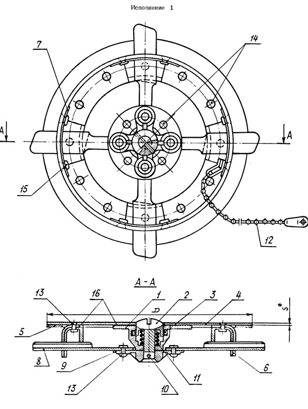 Крышки люков имеют 3 исполнения. Конструкция крышки состоит из фланца (ОСТ 1 13433-78), кнопки (ОСТ 1 13435-78), кольца (2186А), крышки (ОСТ 1 13436-78), прокладки (ОСТ 1 13438-78), корпуса (ОСТ 1 13440-78), сухаря (ОСТ 1 13442-78), лапки (ОСТ 1 13444-78), поводка (ОСТ 1 13445-78), штифта (ГОСТ 3128-70), пружины (1916А), цепочки (ОСТ 11360-73), заклепок (3515А, 3547А, 3531А) и ленты (У-20А ТУ 38-10574-75).