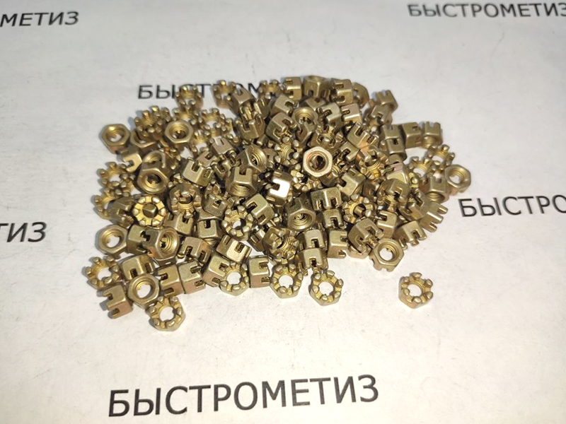 Конструкция гайки состоит из шестигранного стержня с прорезями или видом "короны" и внутреннего отверстия с резьбой.