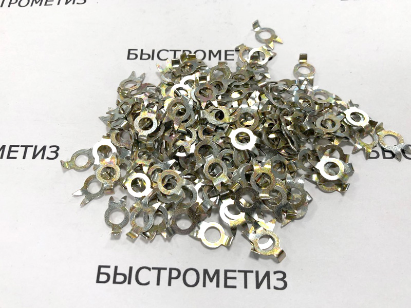 Конструкция шайбы состоит из плоского кольца с прмым лепестком и двумя заостренными усиками.