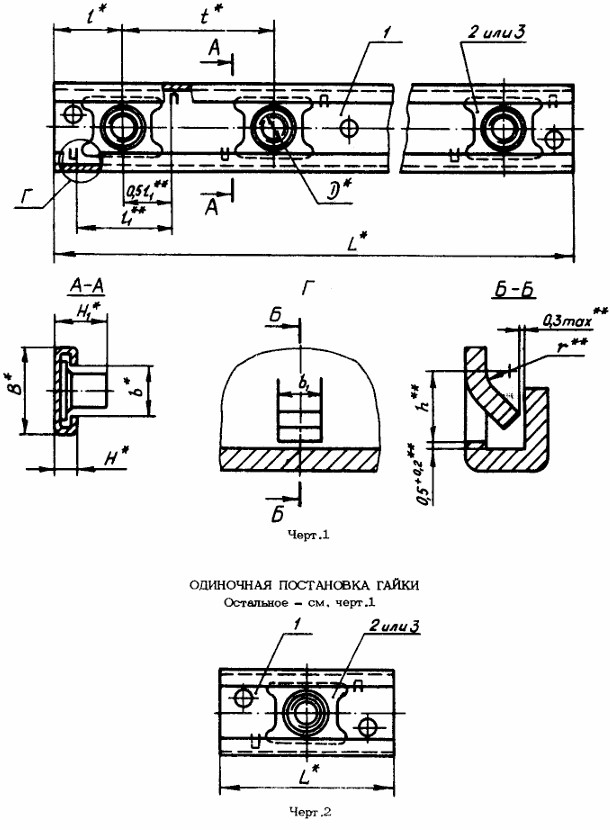 Конструкция профиля состоит из металлической полосы с отверстиями. Поз.1 Профиль (ОСТ 1 11758-76.pdf, ОСТ 1 11759-76.pdf), Поз.2 Гайка (ОСТ 1 37113-89.pdf), Поз.3 Гайка (ОСТ 1 11760-76.pdf)