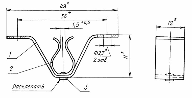 Конструкция состоит из скобы ОСТ 1 11076-73, пружины ОСТ 1 11077-73 и заклепки ОСТ 1 34078-85.